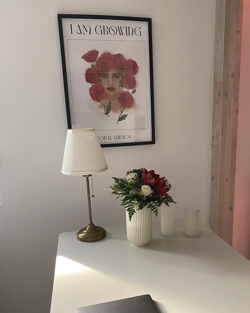 Blumen stehen für Weiblichkeit und Wachstum, Mohnblumen sind zusätzlich ein Symbol für Liebe. In Verbindung mit dem Gesicht einer Frau, welches die Farben der Blüten aufgreift, stärkt es die Wirksamkeit der weiblichen Energie und die Möglichkeit zur Veränderung. Die visuellen Elemente verstärken die Botschaft dieses Kunstwerks „I am growing“, also „ich wachse“. Die rote Farbe unterstreicht die Kraft und Stärke, die dahintersteht. Die Mohnblumen wurden mit Aquarellfarben und Filzstift auf Papier gezeichnet, das Portrait der Frau sowie die Typographie wurden als digitale Zeichnung hinzugefügt.