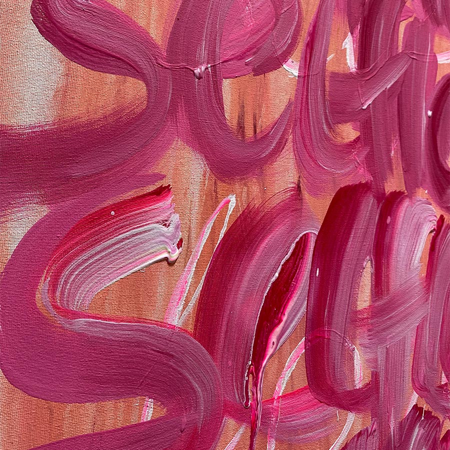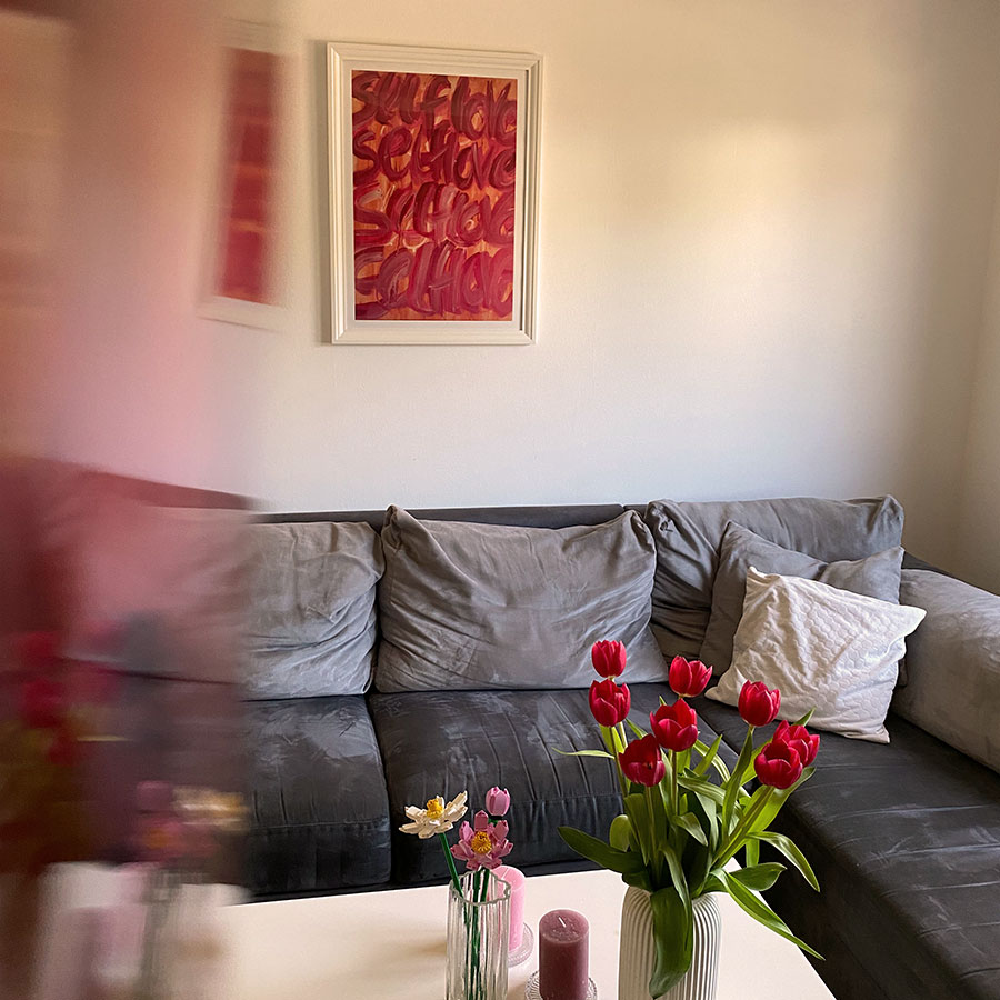 Die Buchstaben in pink auf dem orangefarbenen Hintergrund strahlen Wärme und positive Energie aus. Die weiche Schreibschrift sorgt für ein vertrautes Gefühl wie beim Tagebuch schreiben und einen Hauch Melancholie. Häng dir dieses abstrakte Poster in deinem Wohnzimmer über dem Sofa, deinem Schlafzimmer über dem Bett oder wo auch immer es für dich am besten passt, auf.