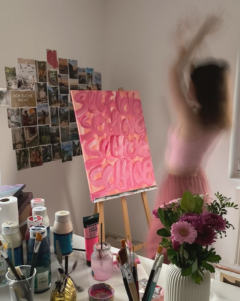 ✨ Einzigartiges Design: Dieses Typografie Poster pink self love mit exklusivem Design ist in einem kreativen Prozess mit Acrylfarben auf Leinwand entstanden und gibt es nur bei Noenya.