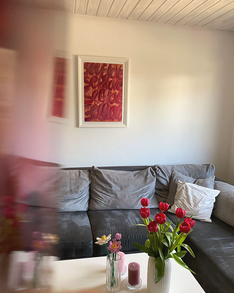 Die Buchstaben in pink auf dem orangefarbenen Hintergrund strahlen Wärme und positive Energie aus. Die weiche Schreibschrift sorgt für ein vertrautes Gefühl wie beim Tagebuch schreiben und einen Hauch Melancholie. Häng dir dieses abstrakte Poster in deinem Wohnzimmer über dem Sofa, deinem Schlafzimmer über dem Bett oder wo auch immer es für dich am besten passt, auf.